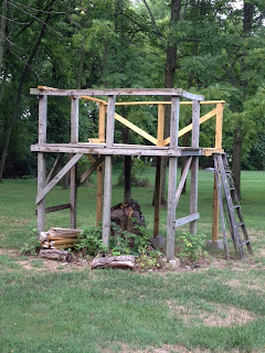 One of the first activities the kids did this summer was to add on to the tree house at my parents house. About five or six years ago my dad built a tree house for the kids in an old apple tree. The rule was that you had to be at least five years old to climb into the tree. It was a platform with some railing, and you had to climb the tree to get in and out. It is about six feet in the air and was about 5'x10', big enough for the five oldest kids to get in and move around a little bit. Over the years it gained a tarp roof, and then the tree died and my dad cut it down leaving just enough of the trunk for the kids to still climb in.
